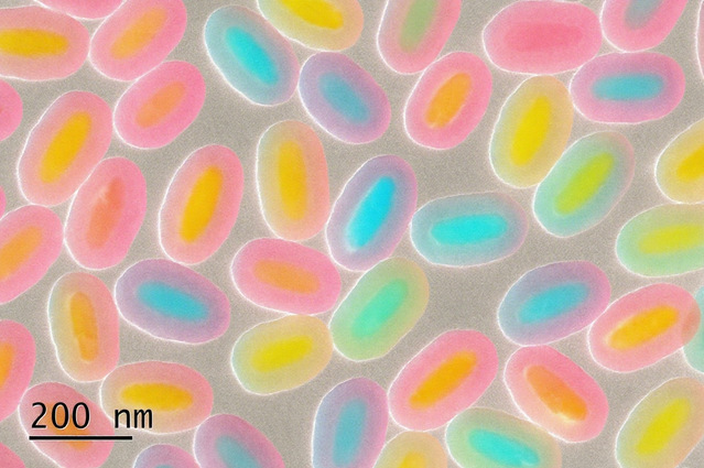 图为TEM拍摄的Fe3O4@SiO2胶体颗粒,经过伪彩处理好像可口的夹心软糖,晶莹剔透的外皮,加上一咬就会爆浆的流心,让人欲罢不能。不同于我们平常吃的夹心软糖简单的制作工艺,采用的SiO2保护的模板转化法需要严格控制反应条件及试剂用量。包覆的二氧化硅层能增强纳米颗粒的稳定性,防止Fe3O4团聚,同时便于加工。